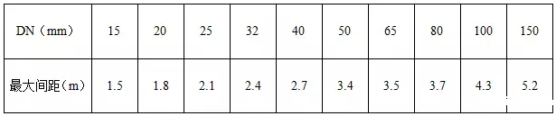 监理工程师熟悉图纸并对照现场复核管路走向,发现问题及时给予设计研究解决。检查预留预埋是否正确;临时剔凿应与设计,土建协调好。监理工程师检查无误后,方可开始管道支吊架安装。支吊架的安装应符合《气体灭火系统施工及验收规范》GB 50263-2007中的5.5.3条规定,管道支吊架安装最大间距应符合下列规定: